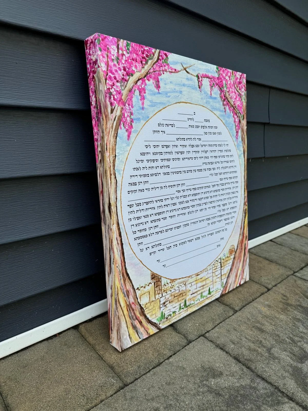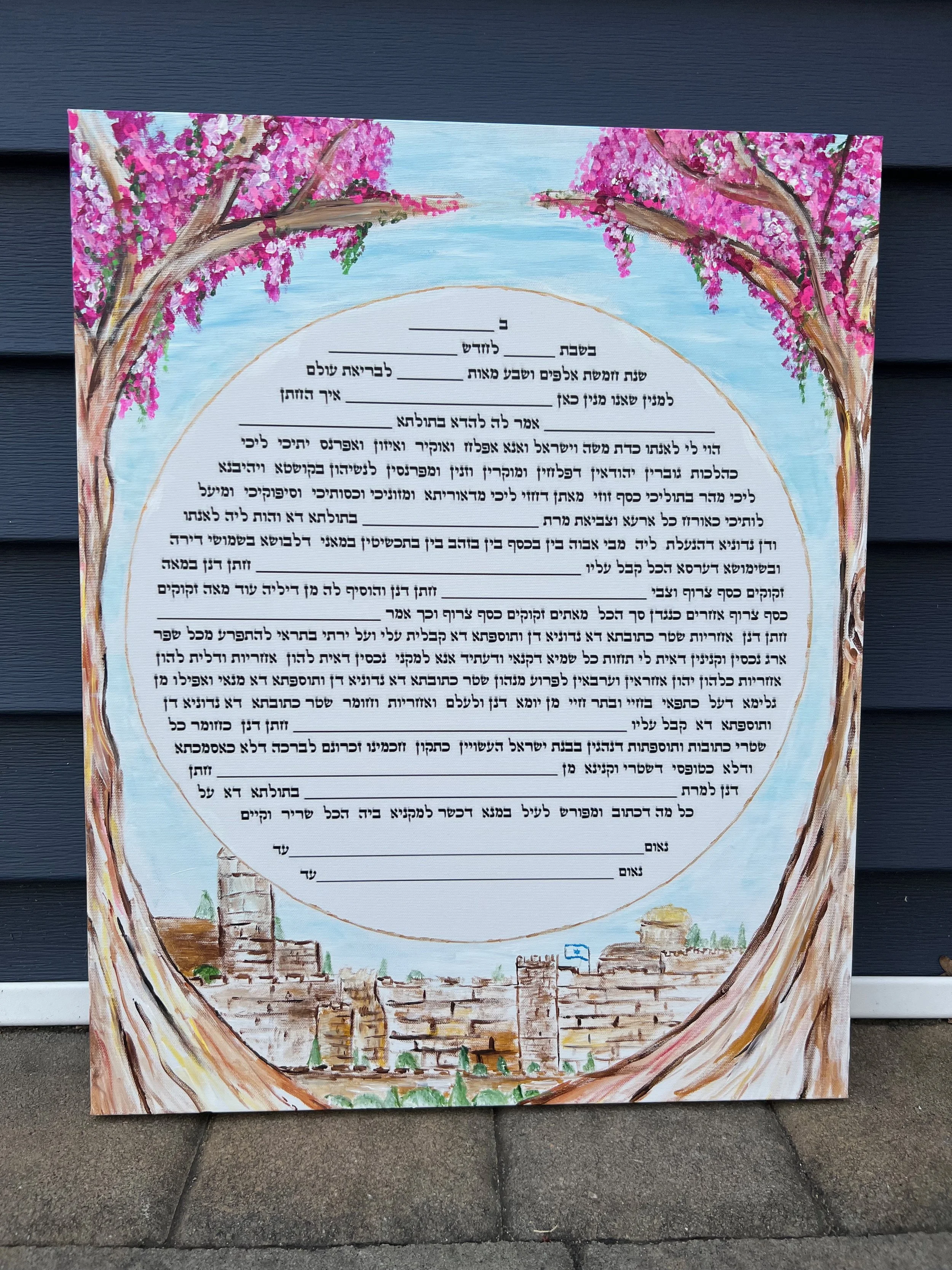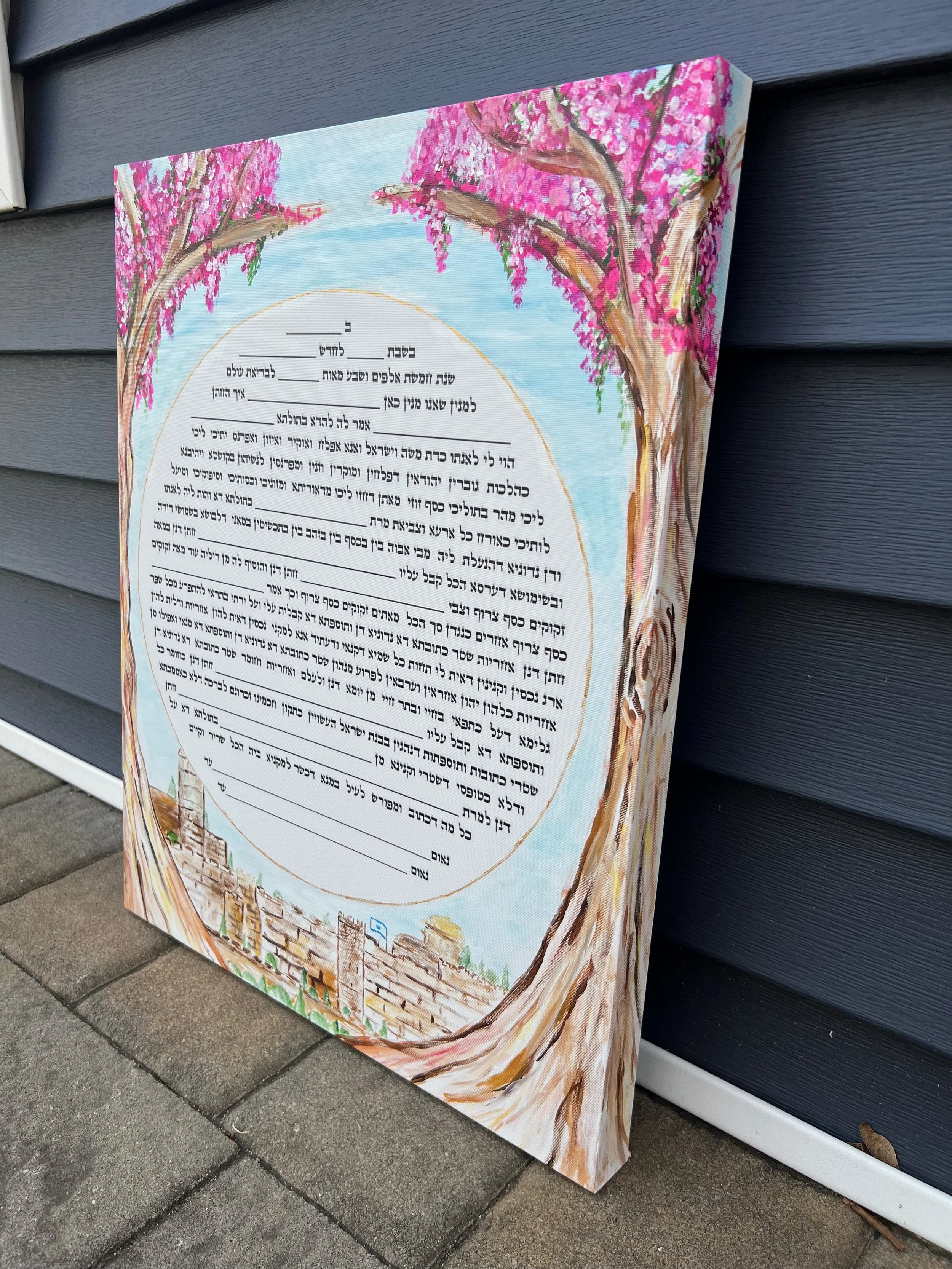 These hand-painted acrylic ketubahs beautifully frame the sacred wedding text with a serene scene. Blossoming trees arch overhead, symbolizing growth and unity, while the Old City of Jerusalem in the background connects the couple to tradition and heritage. The soft colors and delicate details create an elegant backdrop for this meaningful marriage document, read under the chuppah as a symbol of commitment and love.