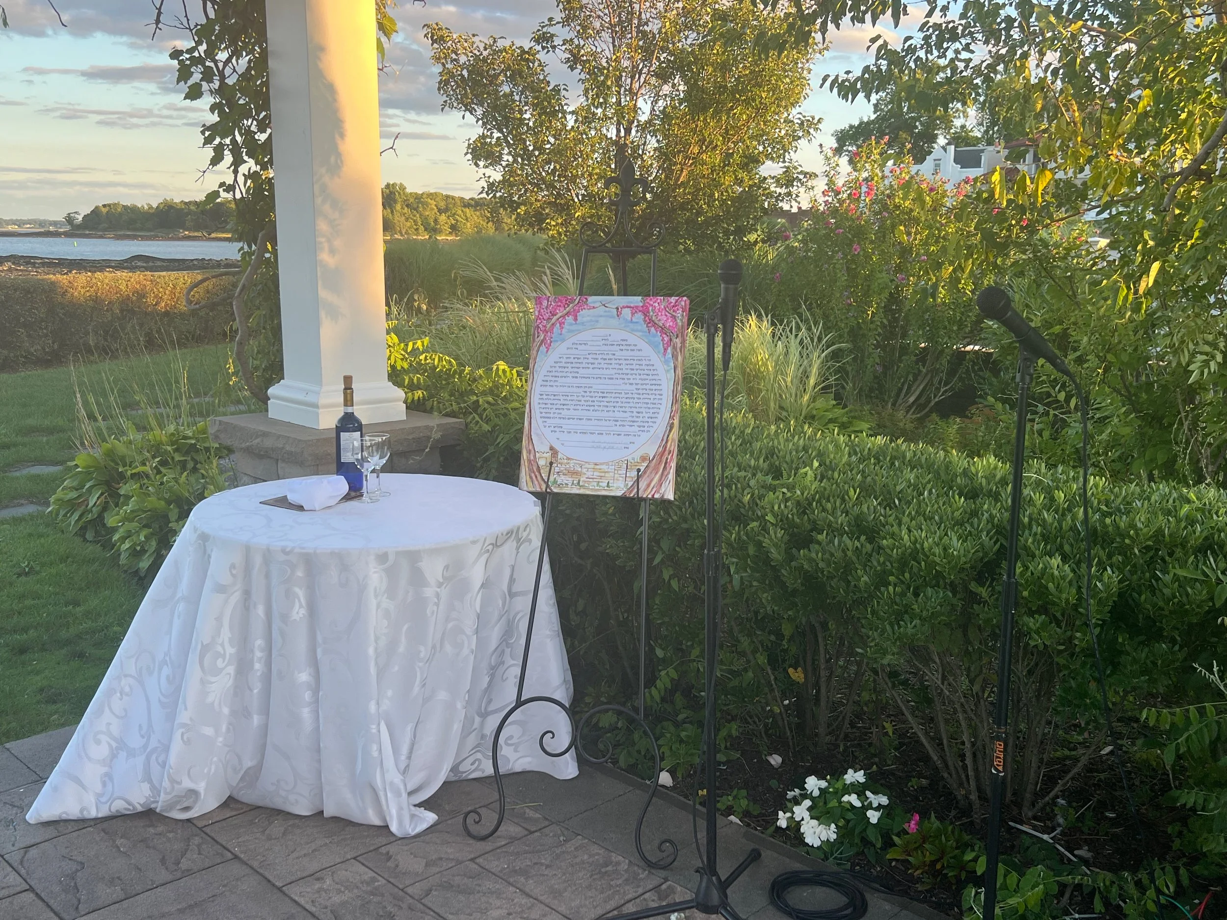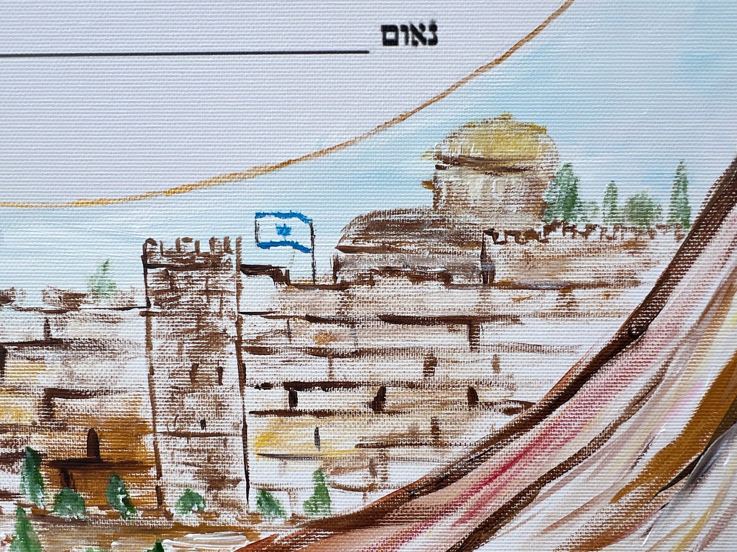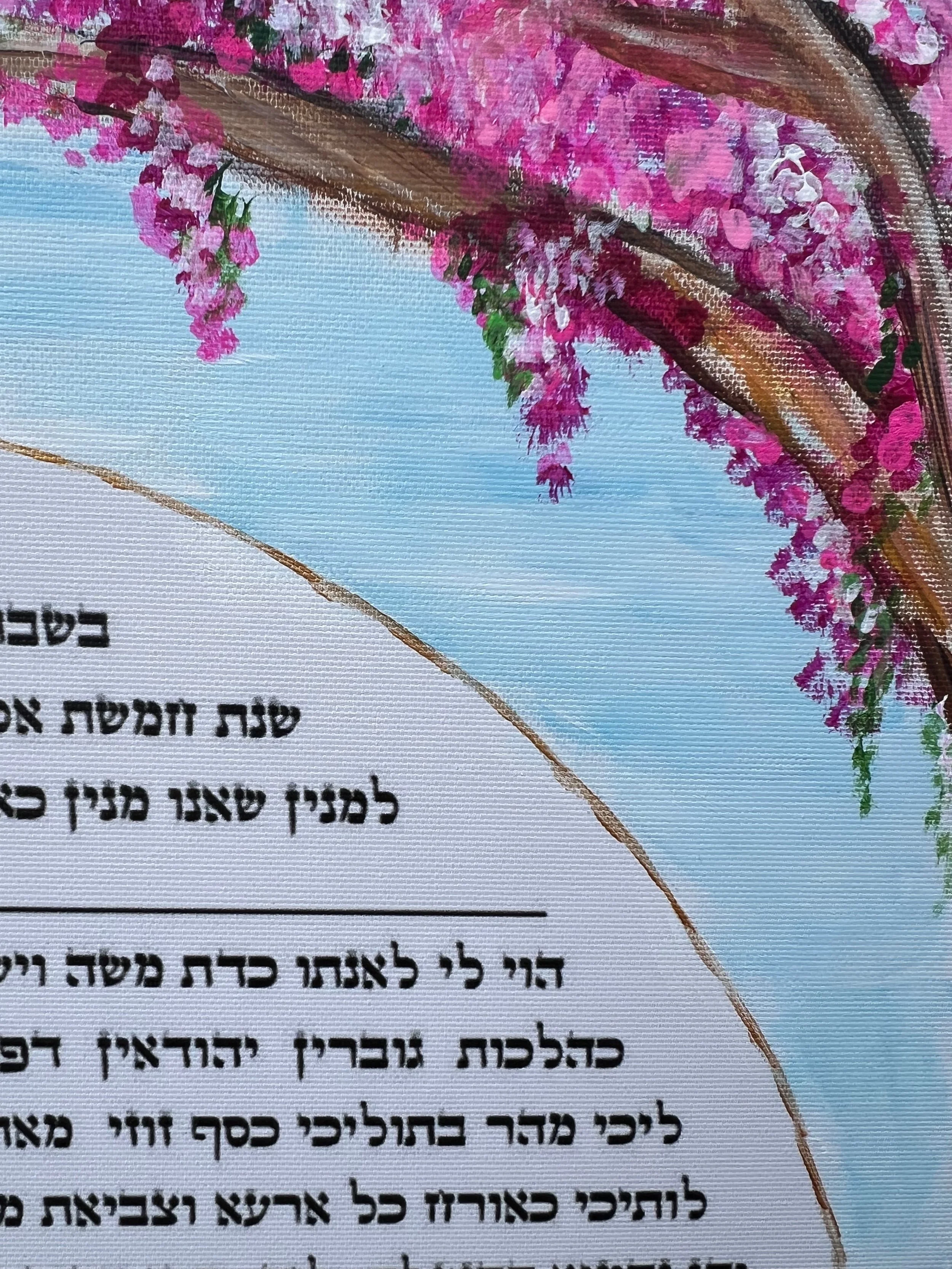 These hand-painted acrylic ketubahs beautifully frame the sacred wedding text with a serene scene. Blossoming trees arch overhead, symbolizing growth and unity, while the Old City of Jerusalem in the background connects the couple to tradition and heritage. The soft colors and delicate details create an elegant backdrop for this meaningful marriage document, read under the chuppah as a symbol of commitment and love.